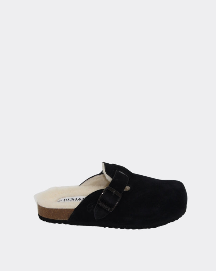 Fur lined close toe slide with moulded sole & buckle feature